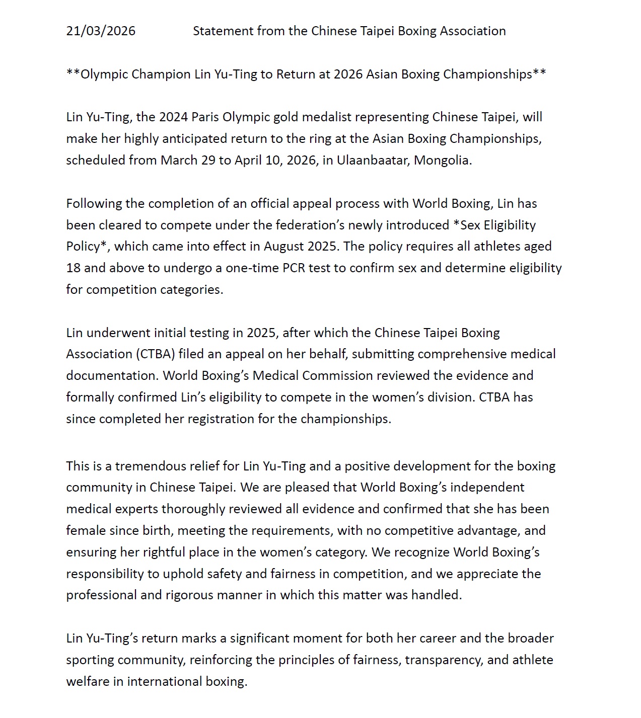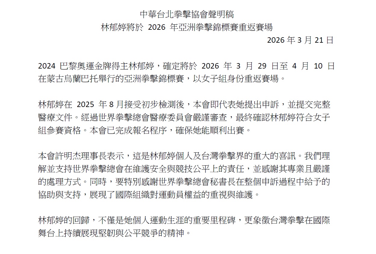 【公告】Statement from the Chinese Taipei Boxing Association/中華台北拳擊協會聲明稿 聲明稿下載: Statement from the Chinese Taipei Boxing Association(English-Chinese Version) 中華民國拳擊協會2026-03-21T01:40:18+08:002026/03/21|協會訊息|